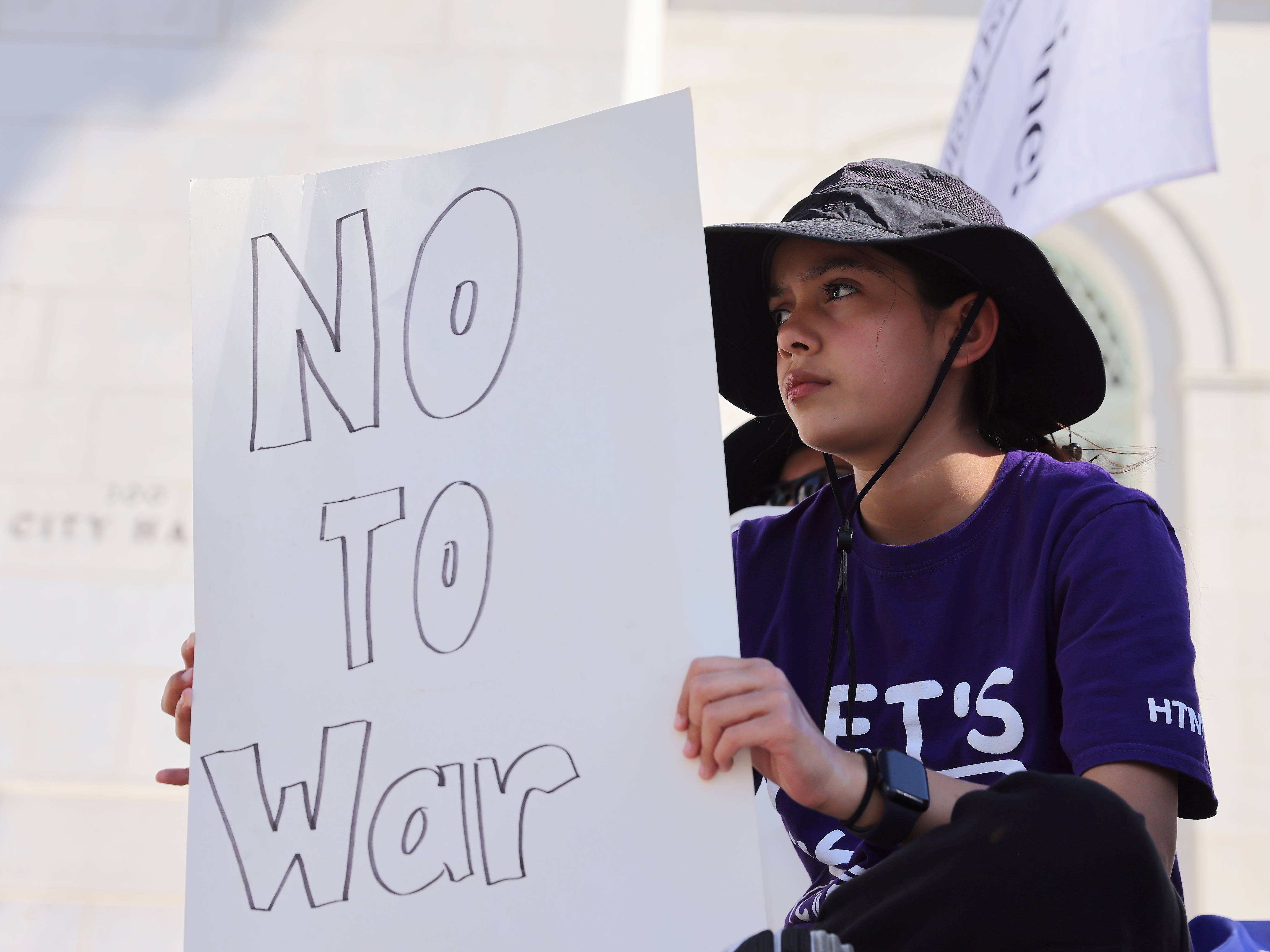 3月7日,在美国加利福尼亚州洛杉矶市政厅前,一名儿童参加集会,抗议美国和以色列对伊朗发动军事打击。新华社发(邱晨摄)肯特:无法昧良心